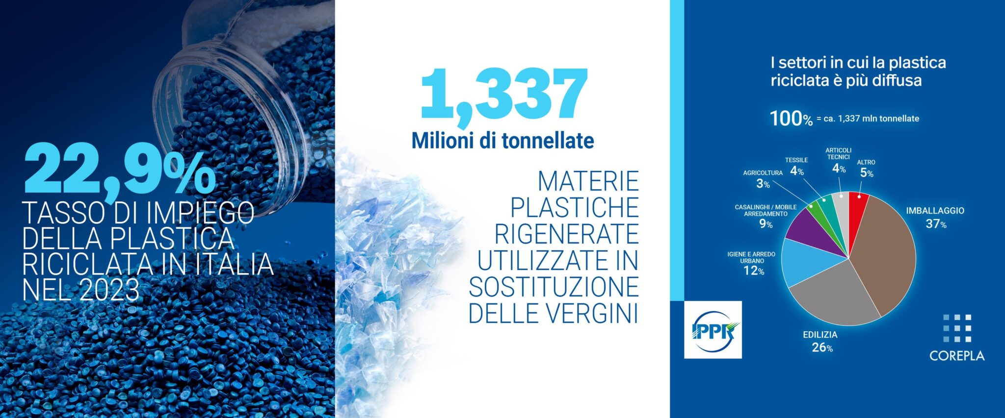 Nel 2023, l’industria italiana della trasformazione ha registrato un nuovo primato nell’impiego di materie plastiche riciclate, confermando il proprio ruolo di eccellenza a livello europeo. Secondo il rapporto “Materie plastiche riciclate utilizzate in Italia” dell’IPPR – Istituto per la Promozione delle Plastiche da Riciclo, sono state utilizzate 1,337 milioni di tonnellate di plastiche rigenerate, sostituendo le plastiche vergini con un tasso di impiego del 22,9% sul totale delle materie plastiche. Questo dato rappresenta una crescita dello 0,8% rispetto al 2022 e del 4,1% rispetto al 2021.