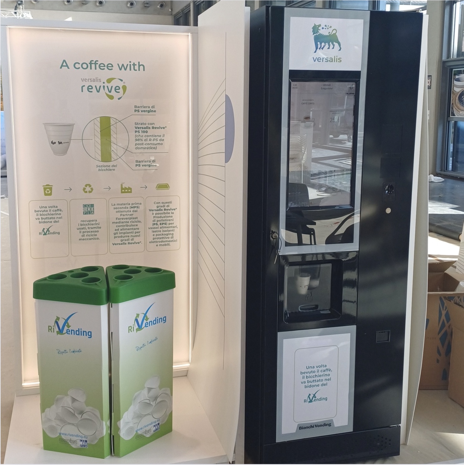 Al loro stand (Padiglione D3, stand 202-303) era possibile bere un ottimo caffè da un distributore automatico brandizzato, con bicchieri realizzati con uno strato interno di Versalis Revive® PS100 che contiene il 98% di R-PS e recuperarli inserendoli negli appositi cestini RiVending!